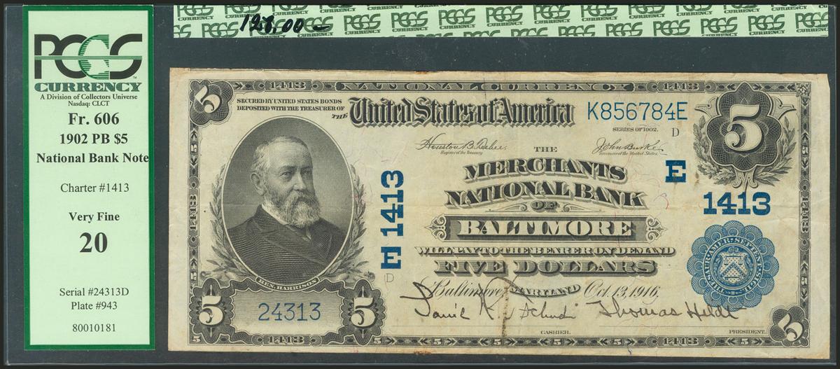 USA. 5 Dollars. National Currency. Maryland. No serial number, October 13, 1916. 1902. (Friedberg: 606 Charter 1413). PCGS20.