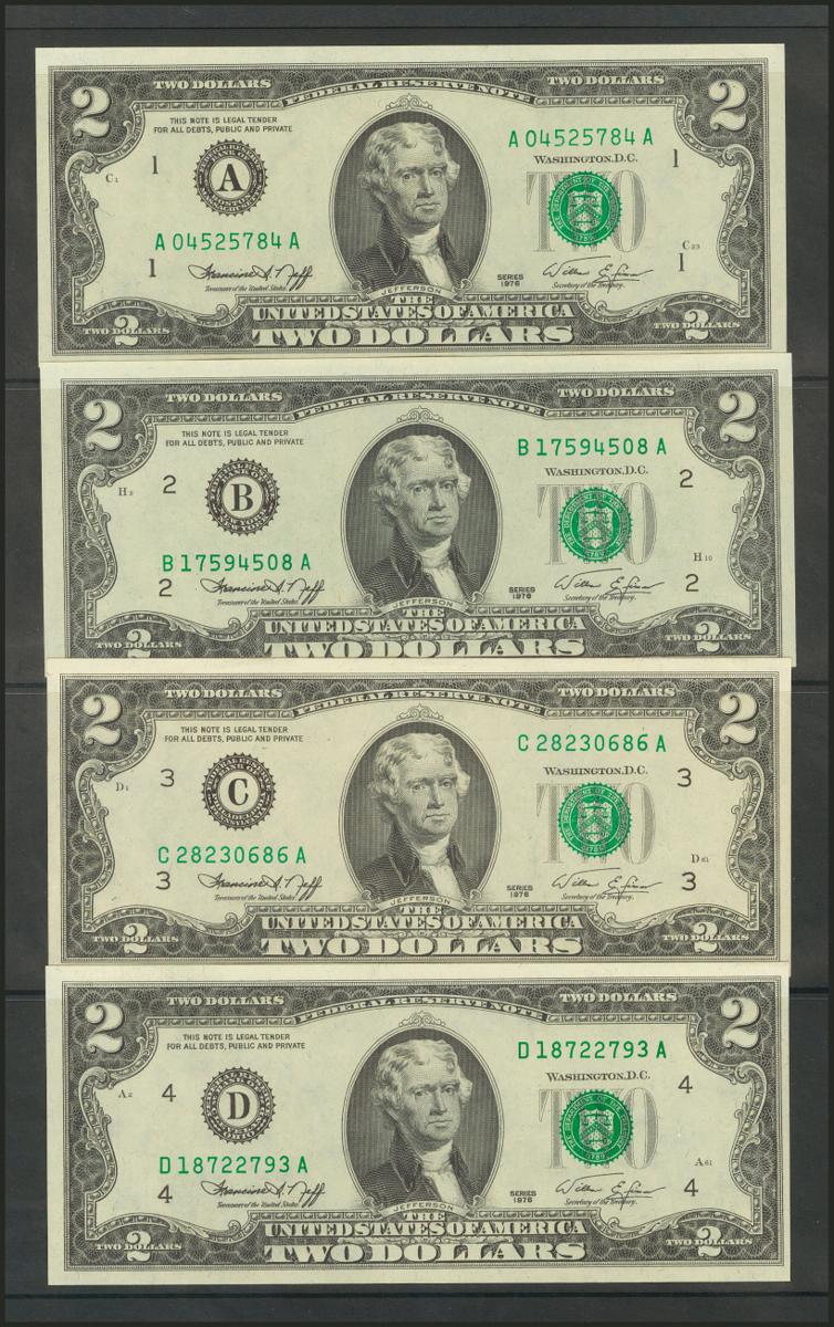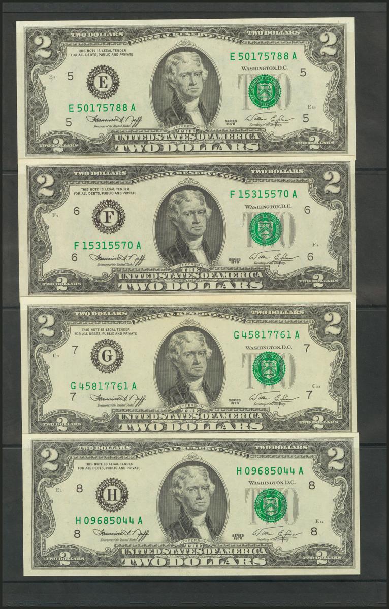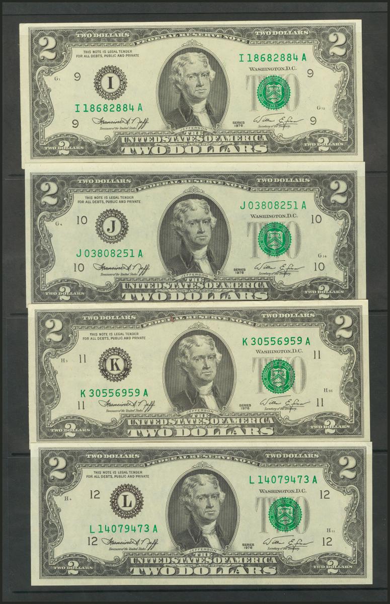 USA. 2 Dollars. Federal Reserve Note. 12 banknotes from serial number A to L (all issuing banks incuded). 1976. (Friedberg: 1535A/L). Nice set. Uncirculated.