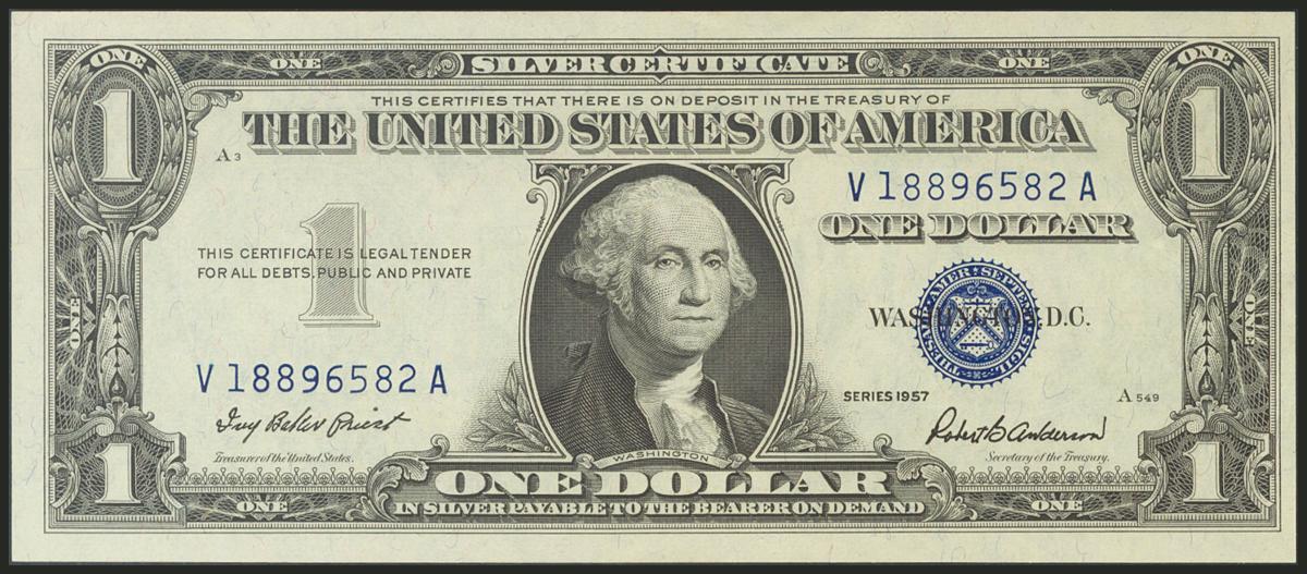 USA. 1 Dollar. Siver Certificate Note. Serial number V-A. 1957. (Friedberg: 1619, Pick: 419). About uncirculated.