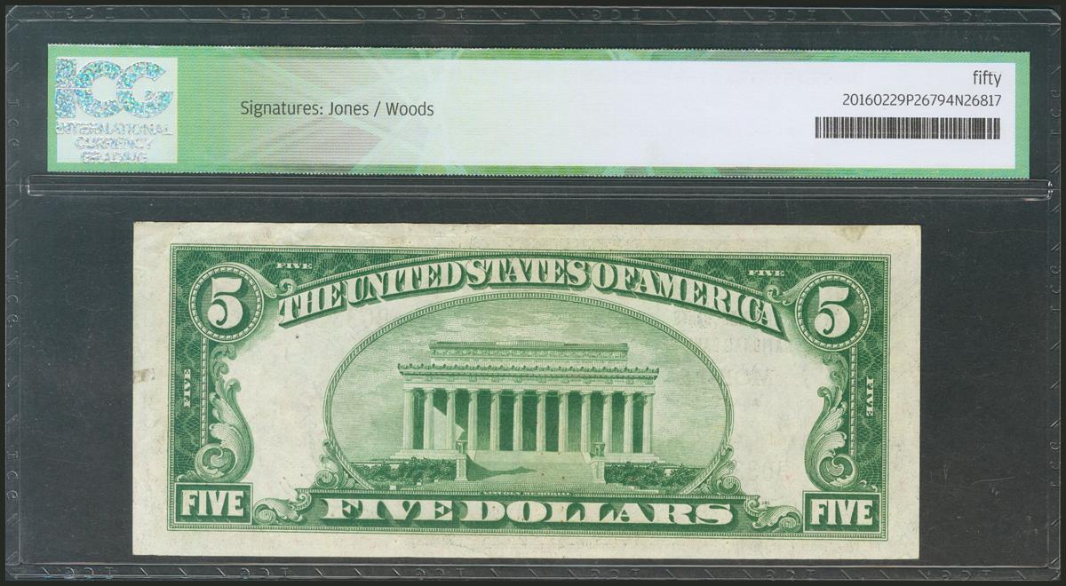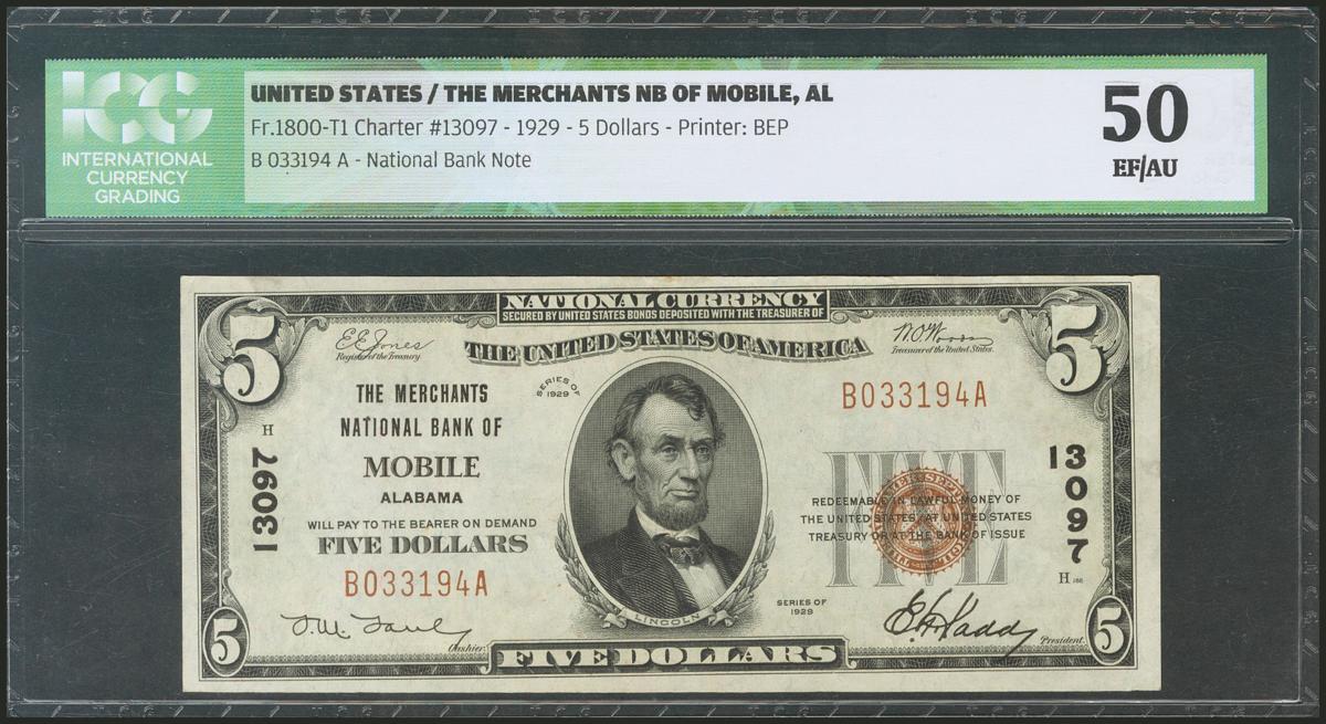 USA. 5 Dollars. National Currency. Alabama. Serial number B-A. 1929. (Friedberg: 1800-T1 Charter 13097). ICG50.