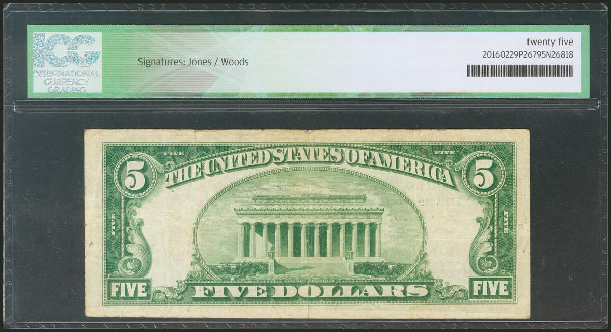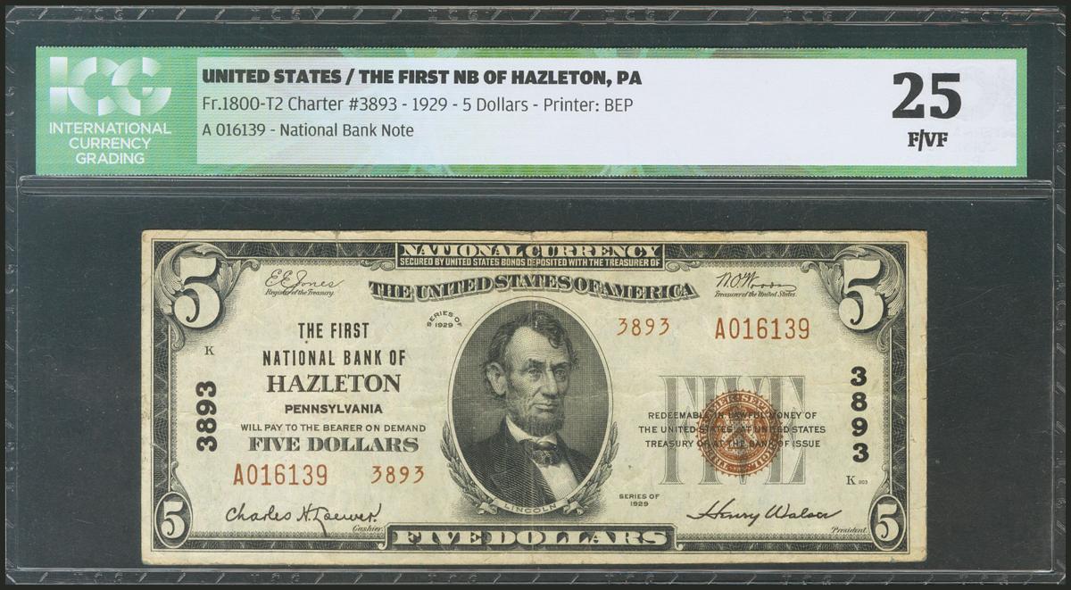 USA. 5 Dollars. National Currency. Pennsylvania. Serial number A. 1929. (Friedberg: 1800-T2 Charter 3893). ICG25.