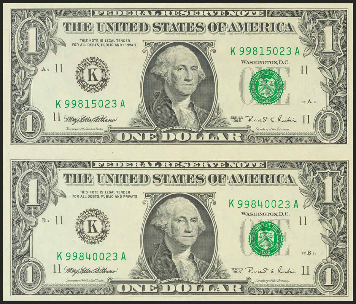 USA. 2 Dollars. Federal Reserve Note. Dallas. Uncuted pair. Serial number K-A. 1995. (Friedberg: 1922K, Pick: 497). Uncirculated.