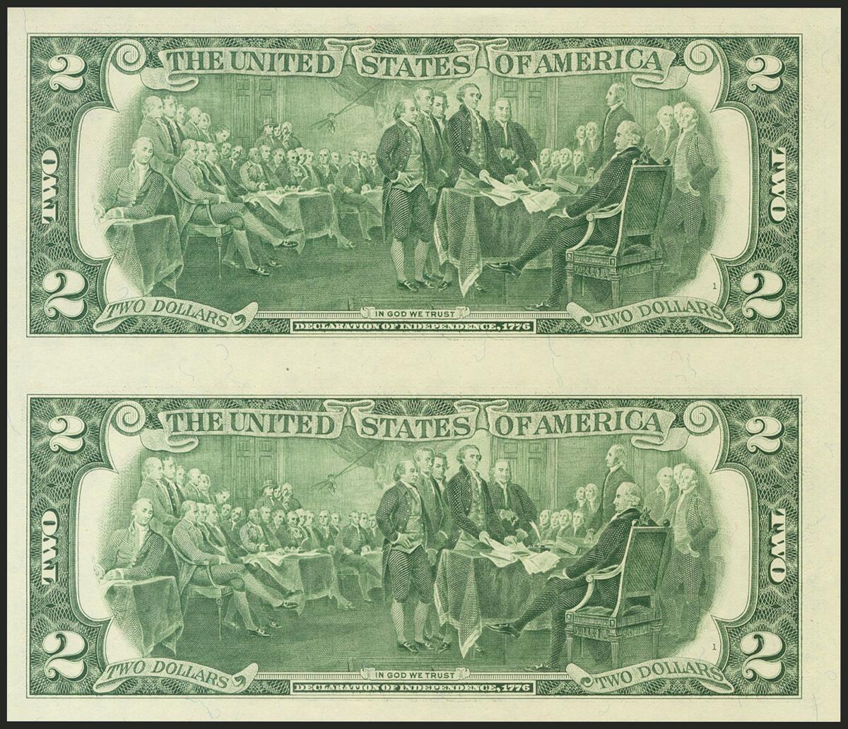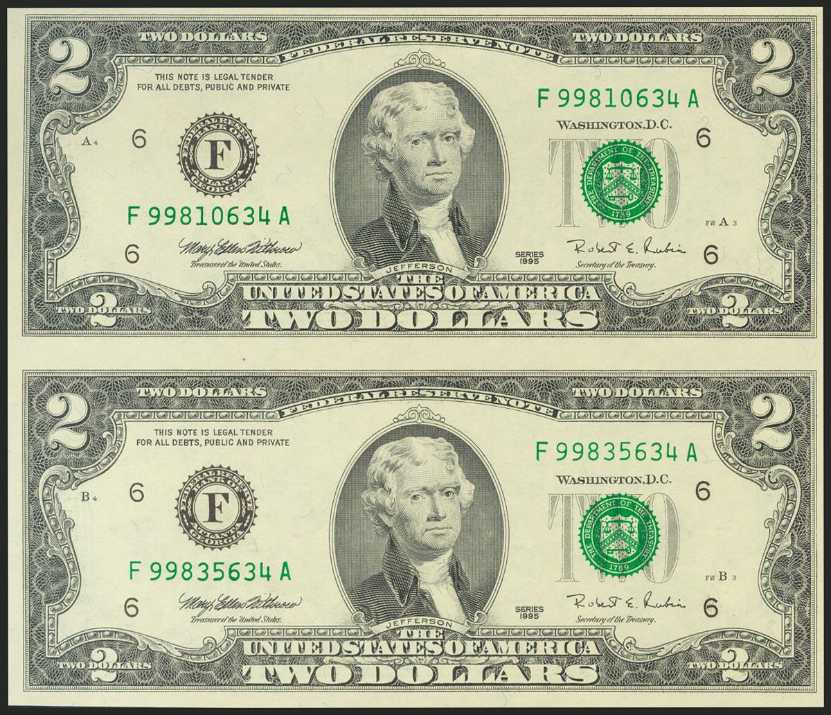 USA. 2 Dollars. Federal Reserve Note. Atlanta. Uncuted pair. Serial number F-A. 1995. (Friedberg: 1936F, Pick: 496). Uncirculated.