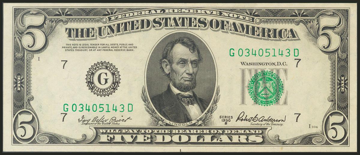 USA. 5 Dollars. Federal Reserve Note. Chicago. Serial number G-D. 1950C. (Friedberg: 1964G, Pick: 438C). Extremely fine.