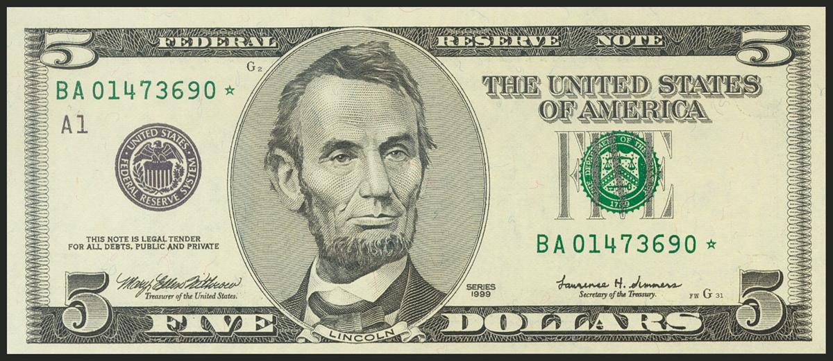 USA. 5 Dollars. Federal Reserve Note. Boston. Serial number BA-* star, replacement. 1999. (Friedberg: 1987A*, Pick: 505*). Uncirculated.