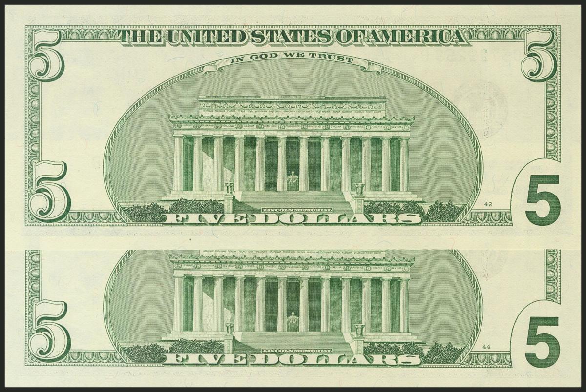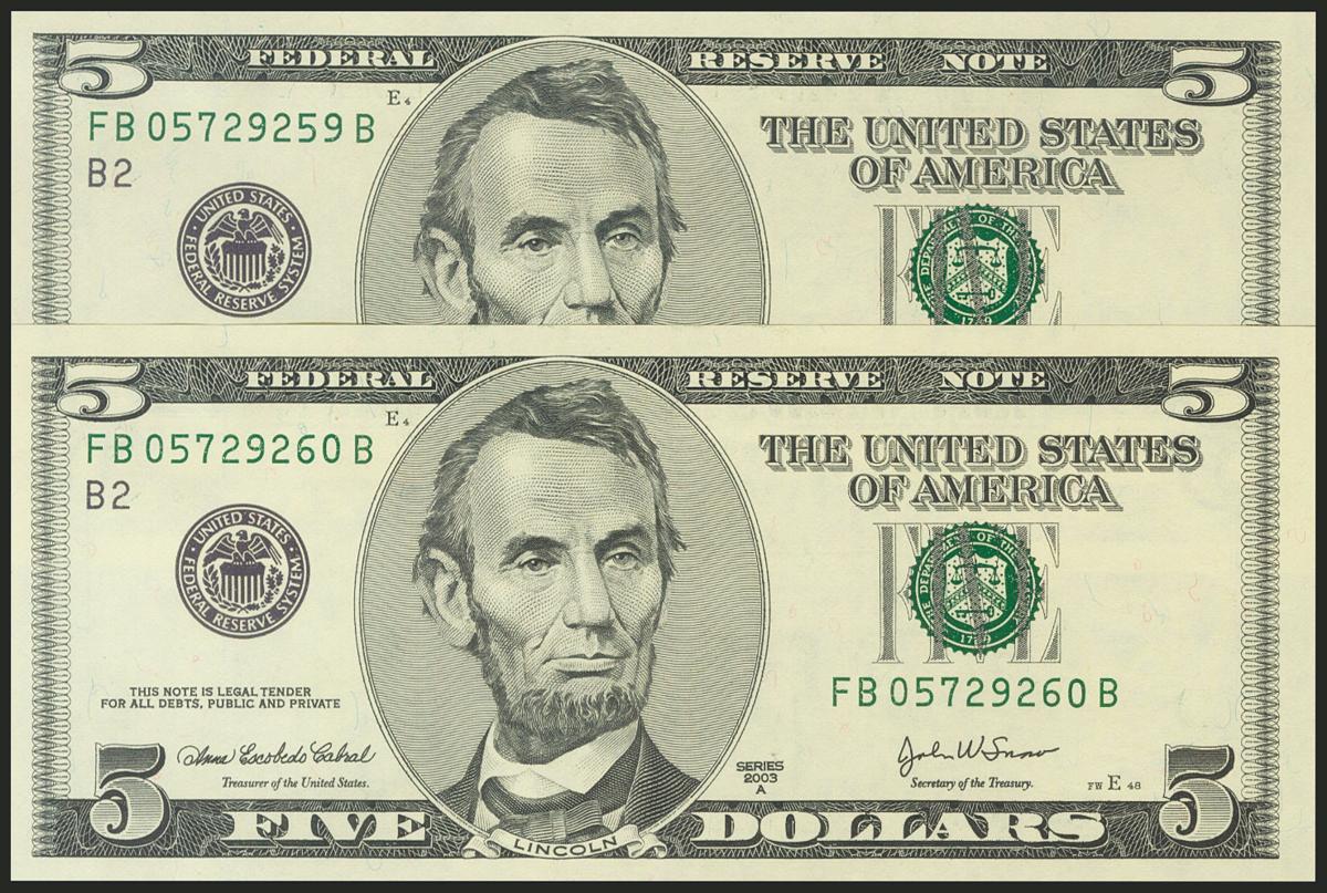 USA. 5 Dollars. Federal Reserve Note. Correlative pair. New York. Serial number FB-B. 2003A. (Friedberg: 1991B, Pick: 516B). Uncirculated.