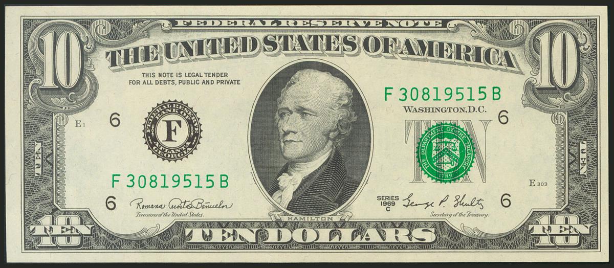 USA. 10 Dollars. Federal Reserve Note. Atlanta. Serial number F-B. 1969C. (Friedberg: 2021F, Pick: 451). Uncirculated.