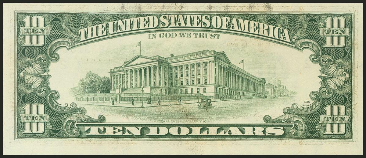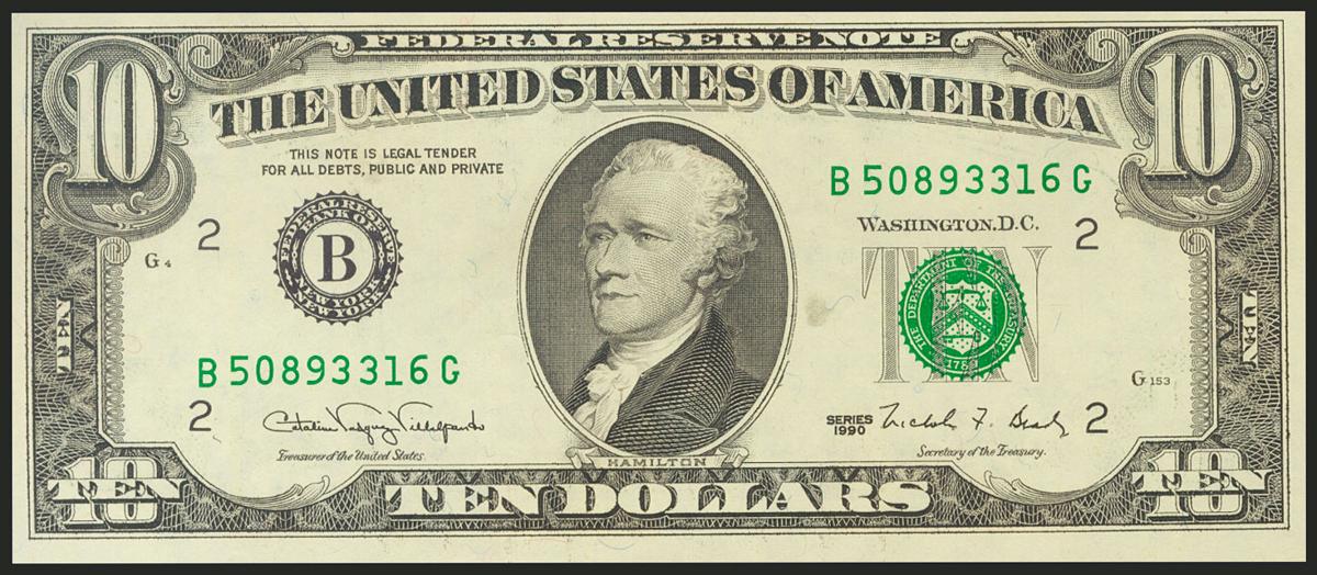 USA. 10 Dollars. Federal Reserve Note. New York. Serial number B-G. 1990. (Friedberg: 2029B, Pick: 486). Uncirculated.