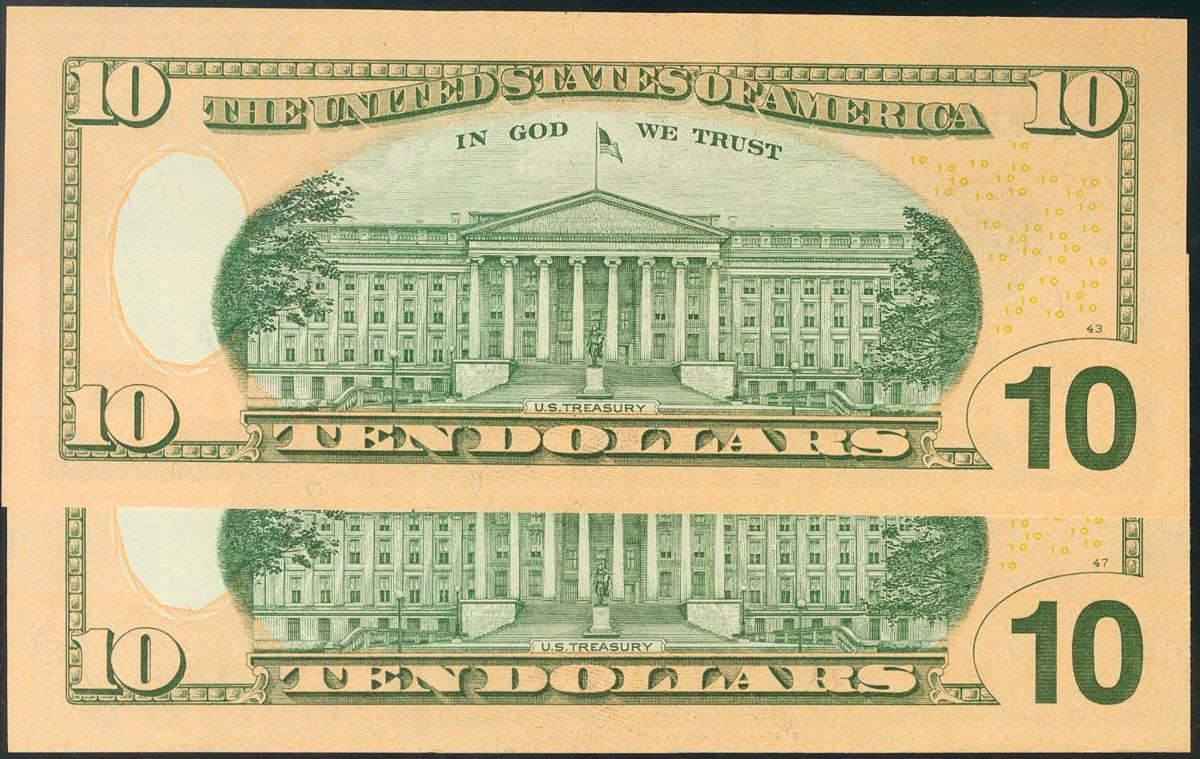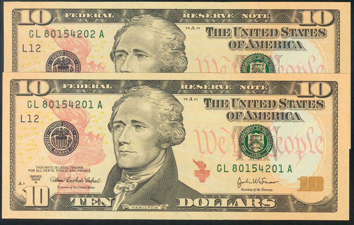 USA. 10 Dollars. Federal Reserve Note. San Francisco. Correlative pair. Serial number L-A. 2004A. (Friedberg: 2039L, Pick: 520). Uncirculated.