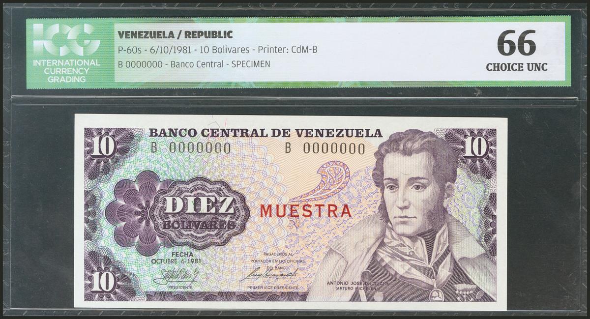 VENEZUELA. 10 Bolívares. 6 October 1981. Specimen B0000000. (Pick: 60s). ICG66.