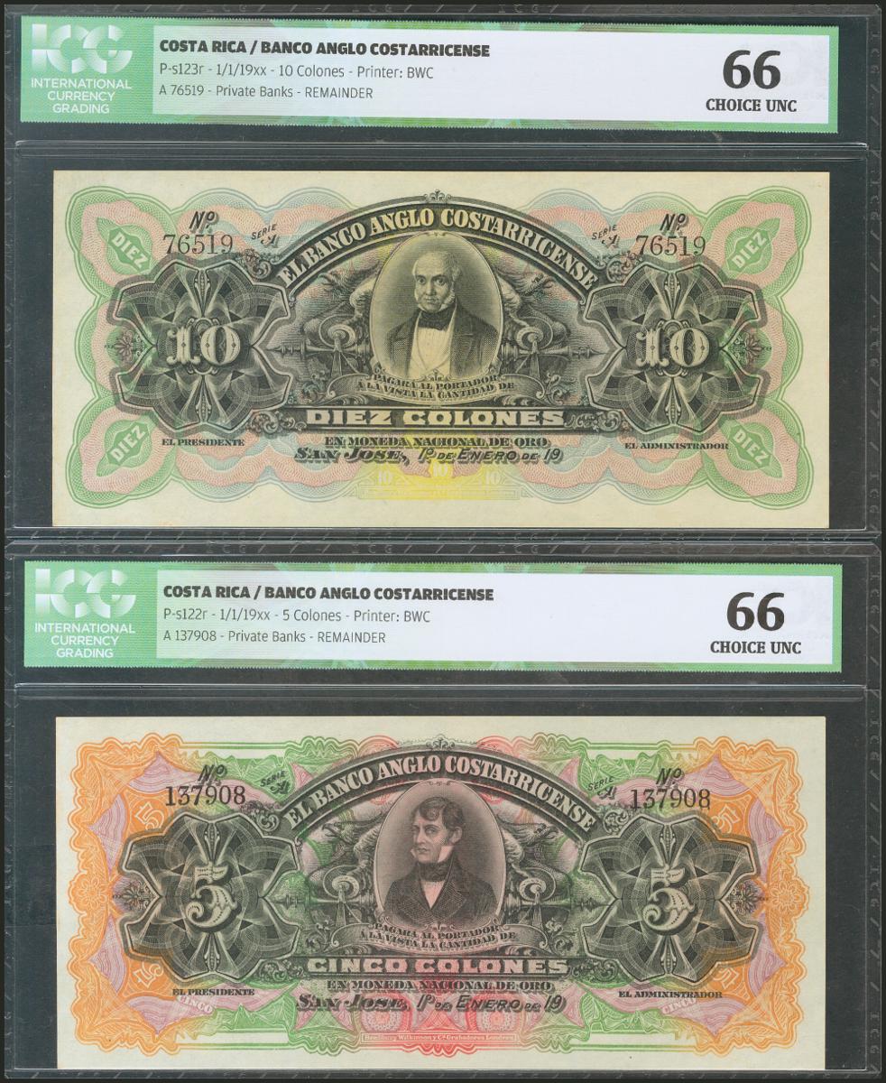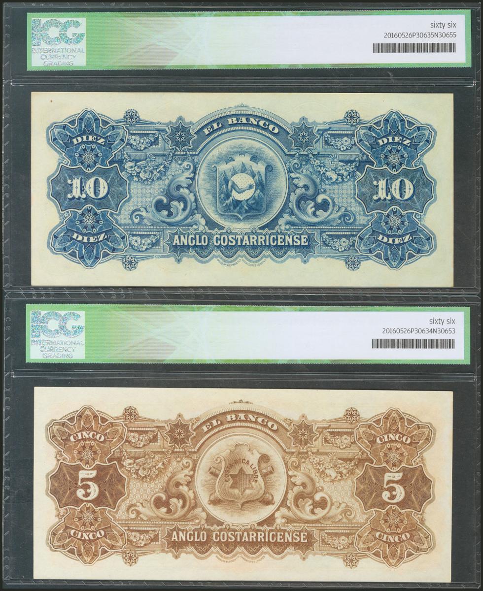 COSTA RICA. BANCO ANGLO COSTARRICENSE. Set of 2 banknotes of 5 and 10 Colones. 1 January 19xx. (Pick: s122r/s123r). ICG66 (both).