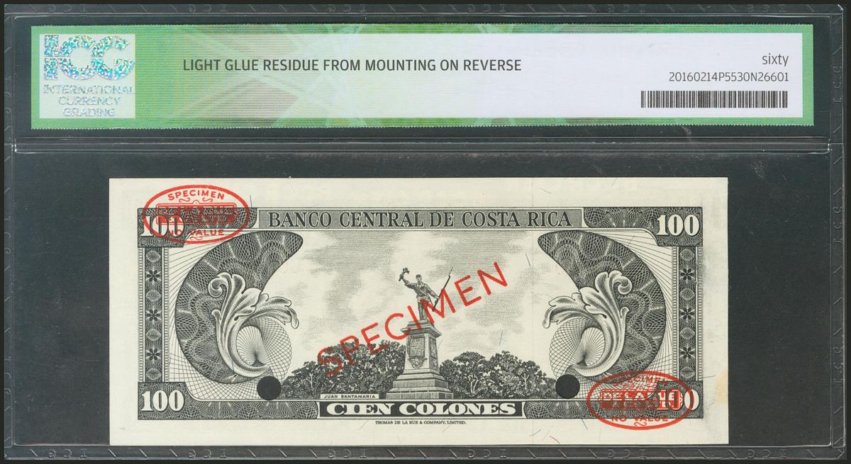 COSTA RICA. 100 Colones. 1966. Specimen. (Pick: 234s). ICG60. (light glue residue from mounting on reverse).