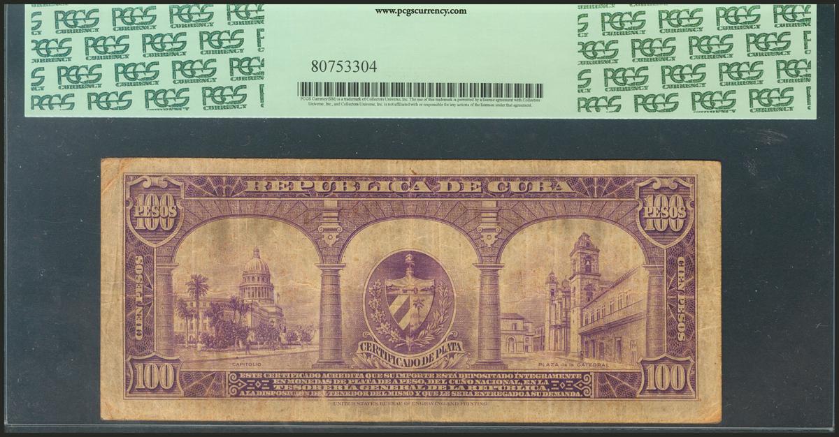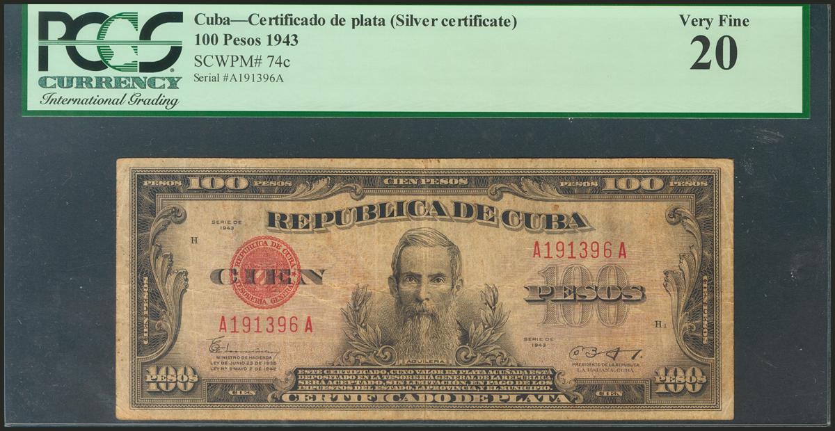 CUBA. 100 Pesos. 1943. Certificado de Plata. (Pick: 74c). PCGS20.