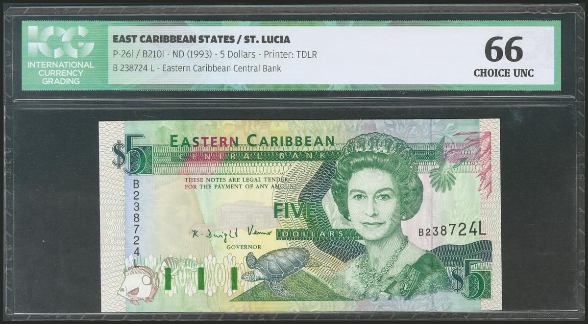 EAST CARIBBEAN STATES. 5 Dollars. 1993. Saint Lucia. (Pick: 26l). ICG66.