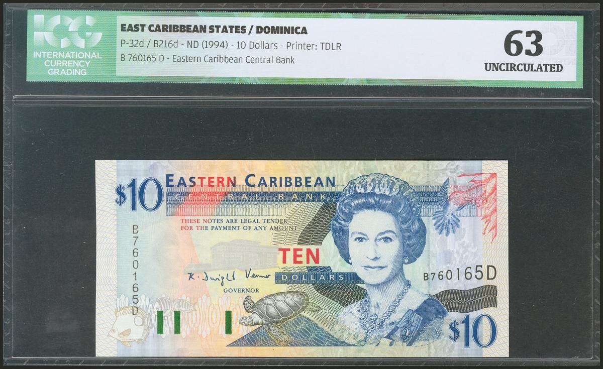 EAST CARIBBEAN STATES. 10 Dollars. 1994. Dominica. (Pick: 32d). ICG63.