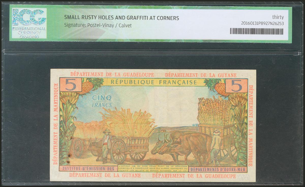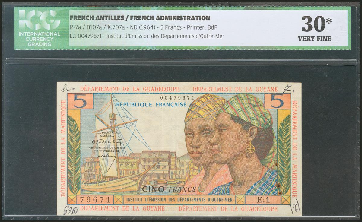 FRENCH ANTILLES. 5 Francs. 1964. (Pick: 7a). ICG30* (small rusty holes and graffiti at corners).