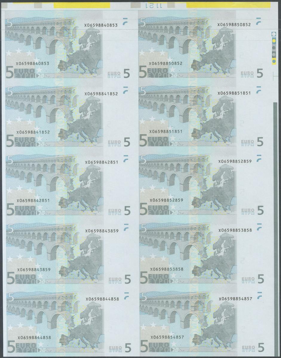 ALEMANIA (GERMANY). 5 Euros. 1 de Enero de 2002. Bloque de 10, sin guillotinar, procedente de la plancha completa de 50 billetes. Serie X, perteneciente al Banco Central alemán. Alemania fue el único país que a modo de "souvenir" emitió controvertidamente los billetes sin guillotinar, posteriormente algunos de esos grandes pliegos fueron cortados de la manera más inverosímil para generar falsas "variedades", que frecuentemente salen al mercado, y donde los coleccionistas menos experimentados adquieren estas piezas de enorme espectacularidad, con el posterior disgusto. SC.
