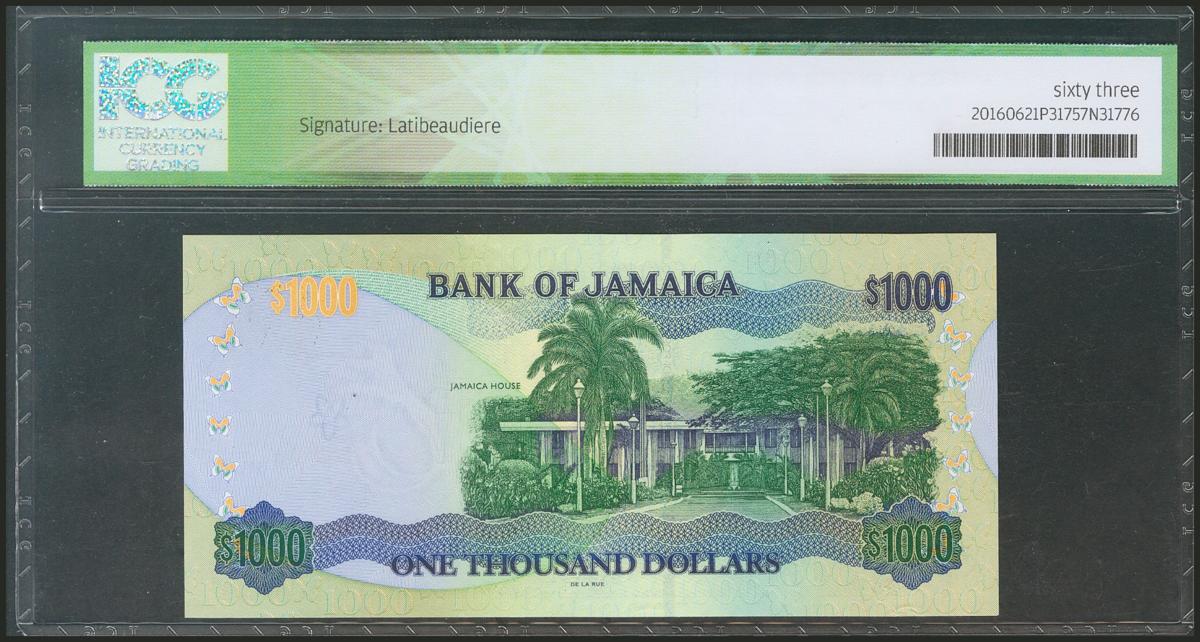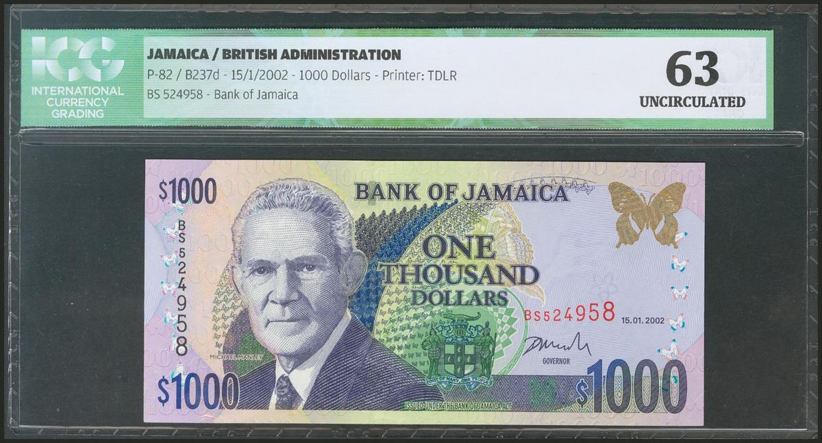 JAMAICA. 1000 Dollars. 15 January 2002. (Pick: 82). ICG63.