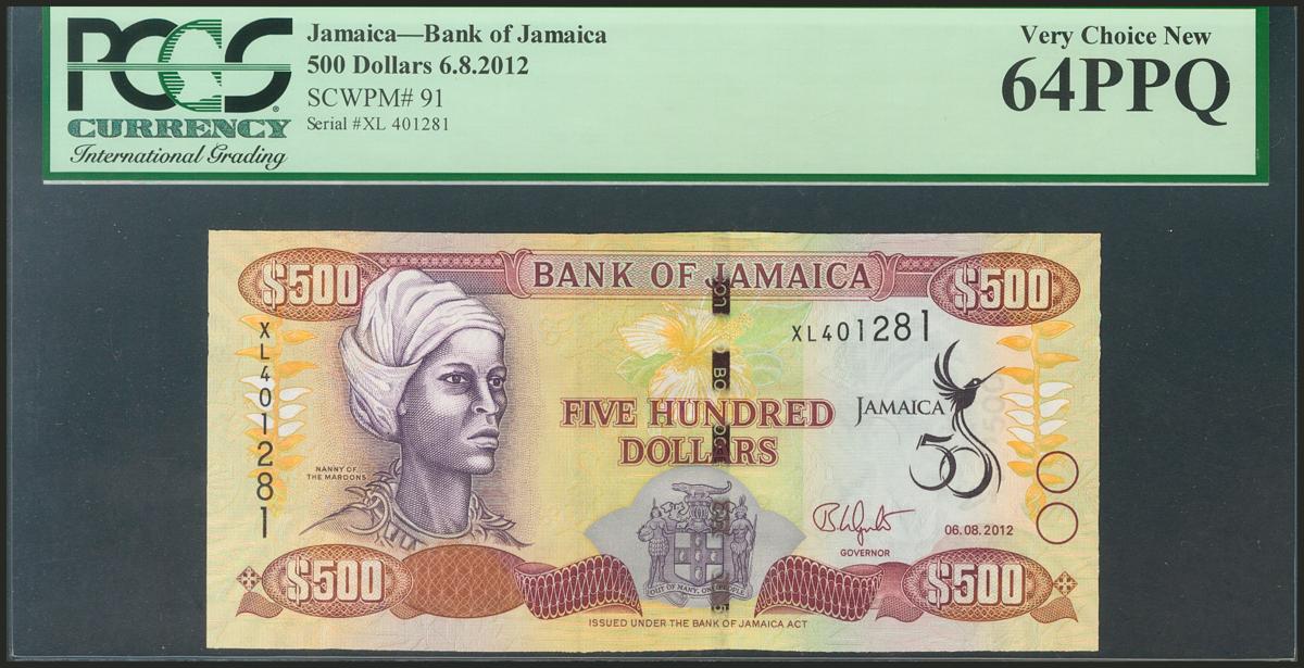 JAMAICA. 500 Dollars. 6 August 2012. (Pick: 91). PMG64PPQ.