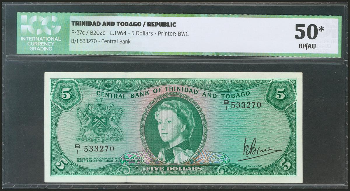 TRINIDAD AND TOBAGO. 5 Dollars. 1964. (Pick: 27c). ICG50* (light stain top left on reverse).
