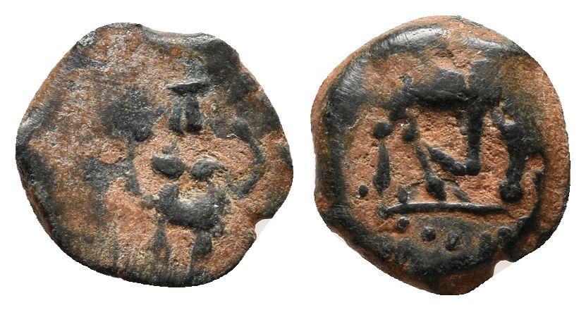 EBUSUS. 1/8 Calco. 200-100 a.C. Ibiza (Islas Baleares). A/ Bes de frente sosteniendo un martillo y una serpiente. R/ Toro embistiendo a derecha. FAB-924. Ae. 0,98g MBC.