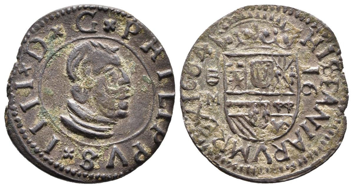 FELIPE IV. 16 Maravedís. 1664. Valladolid M. Cal-1674; J.S. M-820. Ae. 4,00g. MBC+. Escasa.