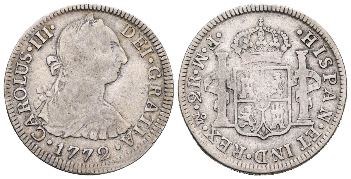 CARLOS III. 2 Reales. 1772. México FM. Ceca y ensayadores invertidos. Cal-1337. Ar. 6,56g. MBC-. Rara.