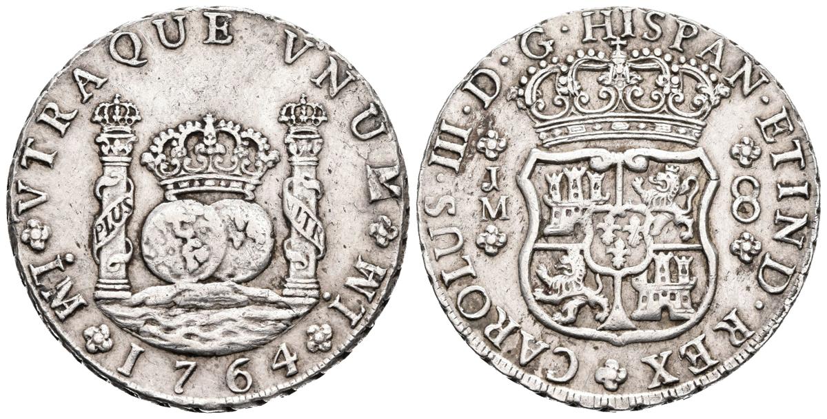 CARLOS III. 8 Reales. 1764. Lima JM. Columnario. Puntos sobre las dos LMA. Cal-840. Ar. 26,90g. MBC+.