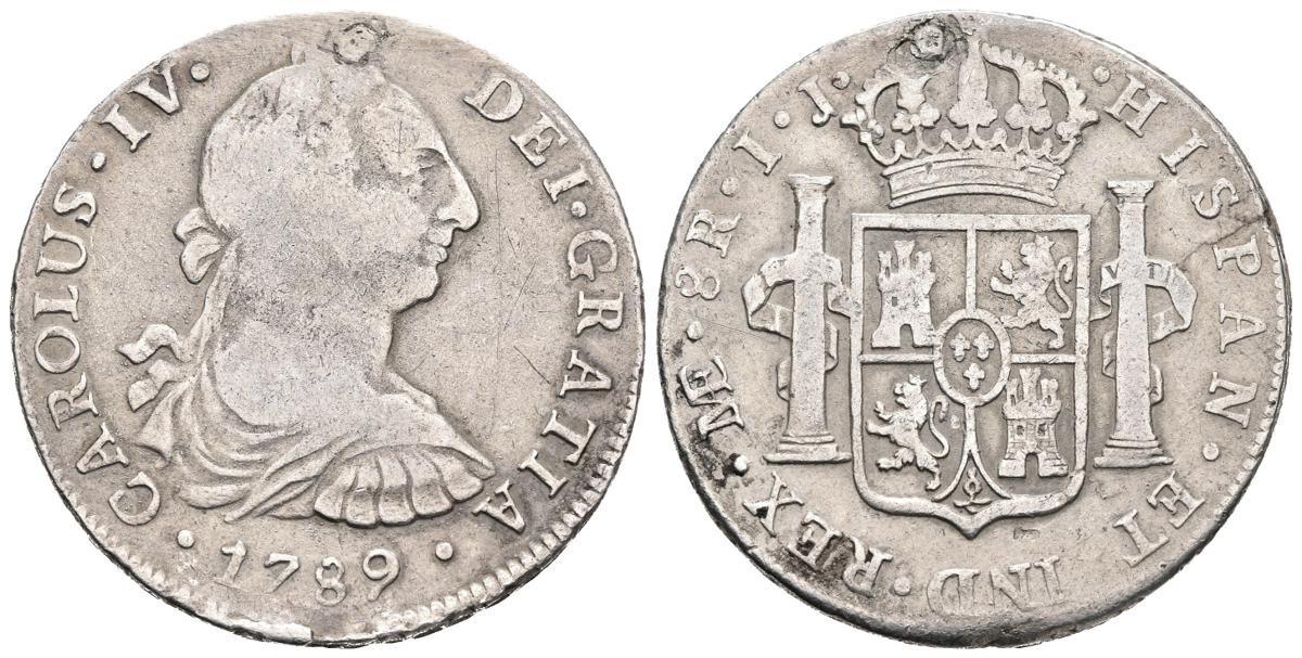 CARLOS III. 8 Reales. 1789. Lima IJ. Busto de Carlos III y ordinal IV. Cal-641. Ar. 26,71g. Perforación reparada. BC+. Escasa.