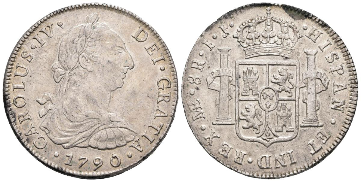 CARLOS IV. 8 Reales. 1790. Lima IJ. Busto de Carlos III con ordinal IV. Cal-642. Ar. 27,05g. MBC+. Escasa.