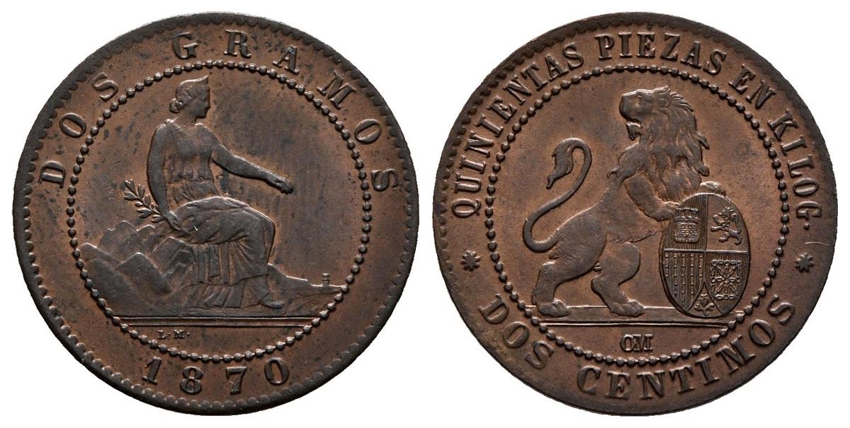 GOBIERNO PROVISIONAL. 2 Céntimos. 1870. Barcelona OM. Cal-26. Ae. 2,02g. SC-.