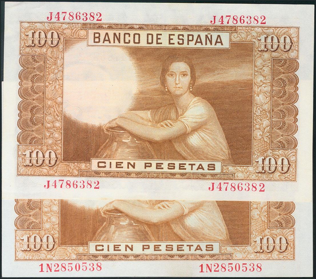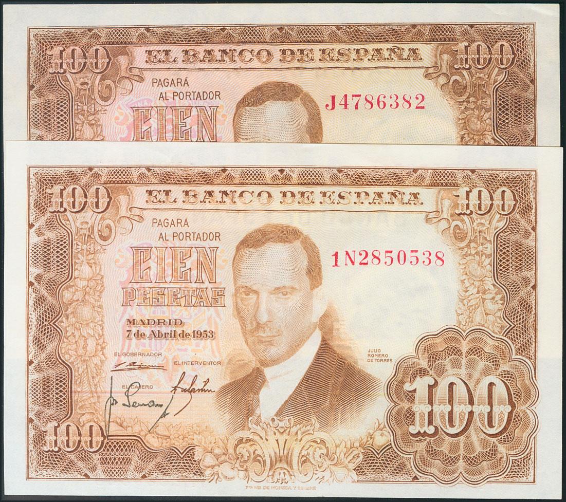 Conjunto de dos billetes de 100 Pesetas de la emisión del 7 de Abril de 1953. Serie J castaño oscuro y serie 1N castaño claro. (Edifil 2017: 464b, 464c). EBC/EBC+.