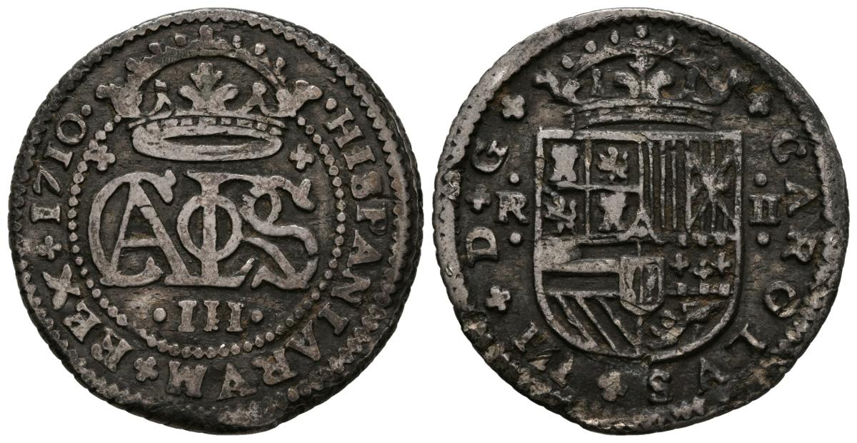 English CHARLES III, the Pretender (1700-1714). 2 Real. (Ar. 5.41g / 27mm). 1710. Barcelona. (Cal-2019-31). VG.