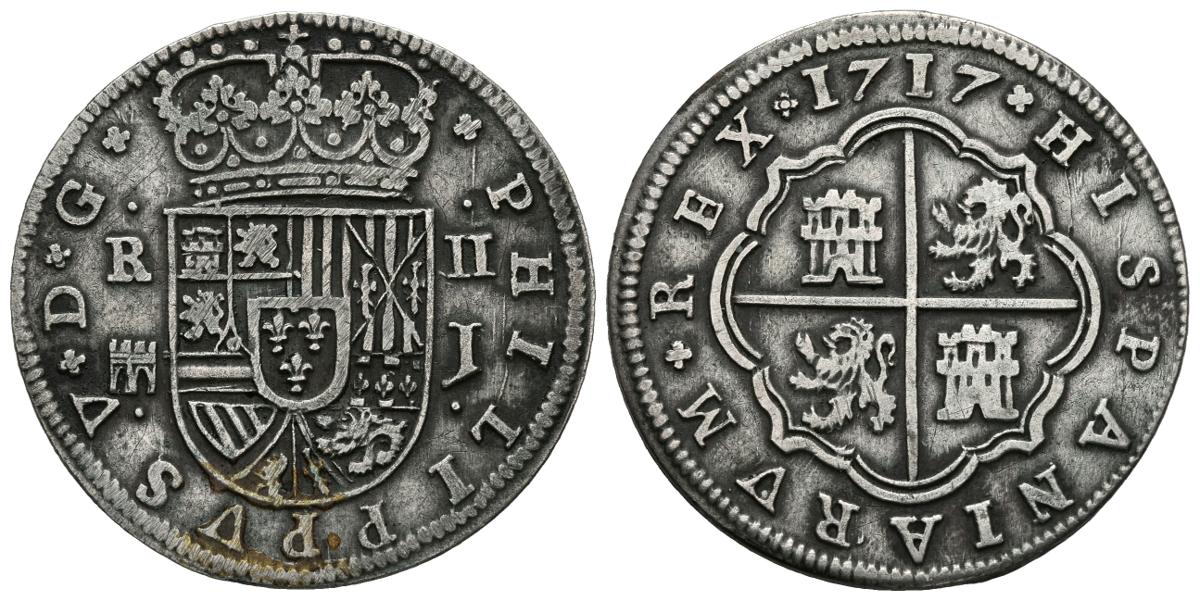 FELIPE V (1700-1746). 2 Real. (Ar. 5.91g / 28mm). 1717. Segovia J. (Cal-2019-944). F.