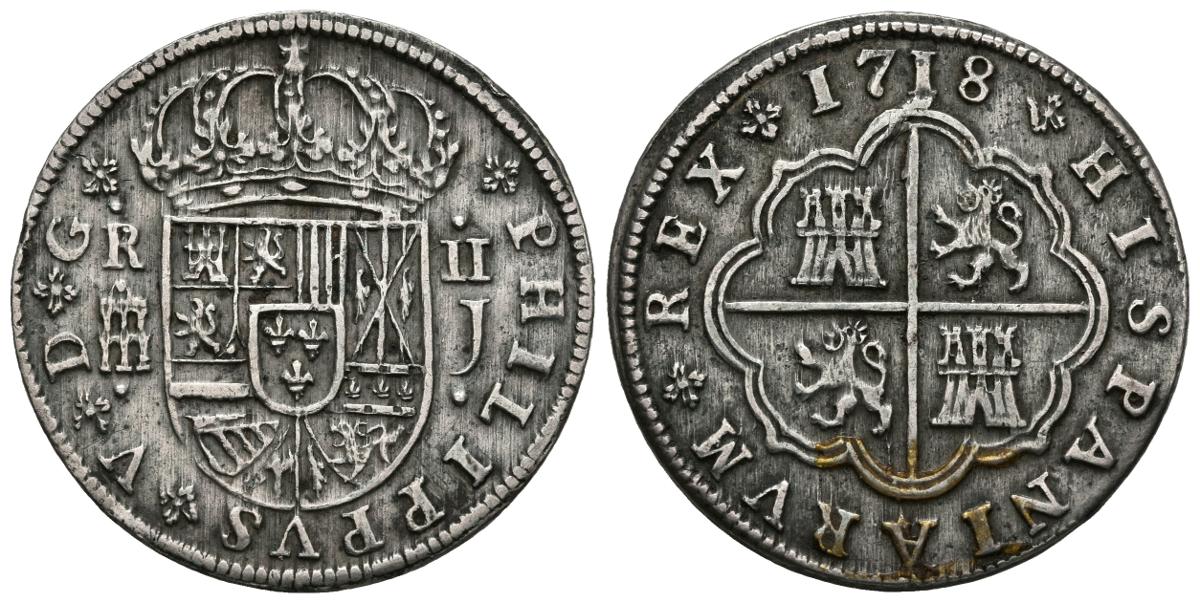 English FELIPE V (1700-1746). 2 Real. (Ar. 5.12g / 27mm). 1718. Segovia J. (Cal-2019-947). VF.