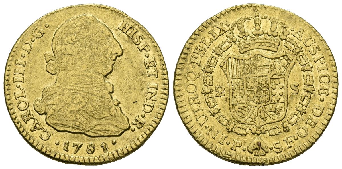 CHARLES III (1759-1788). 2 Shields. (Au 6.75g / 22mm). 1781/0. Popayan SF. (Cal-2019-1640). VG.