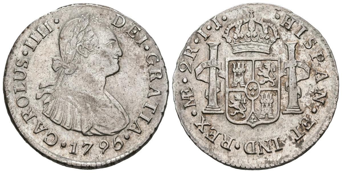 English CHARLES IV (1788-1808). 2 Real. (Ar. 6.66g / 28mm). 1795. Lima IJ. (Cal-2019-578). VF. Scarce in this quality.