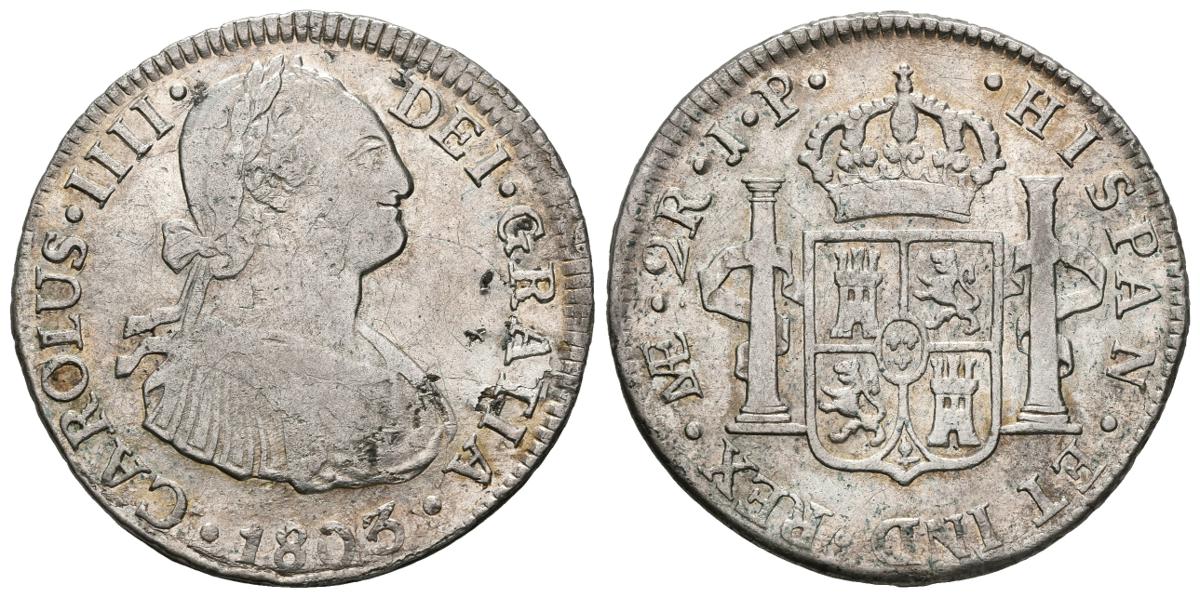 CHARLES IV (1788-1808). 2 Real. (Ar. 6.35g / 27mm). 1803. Lima JP. (Cal-2019-588). F.