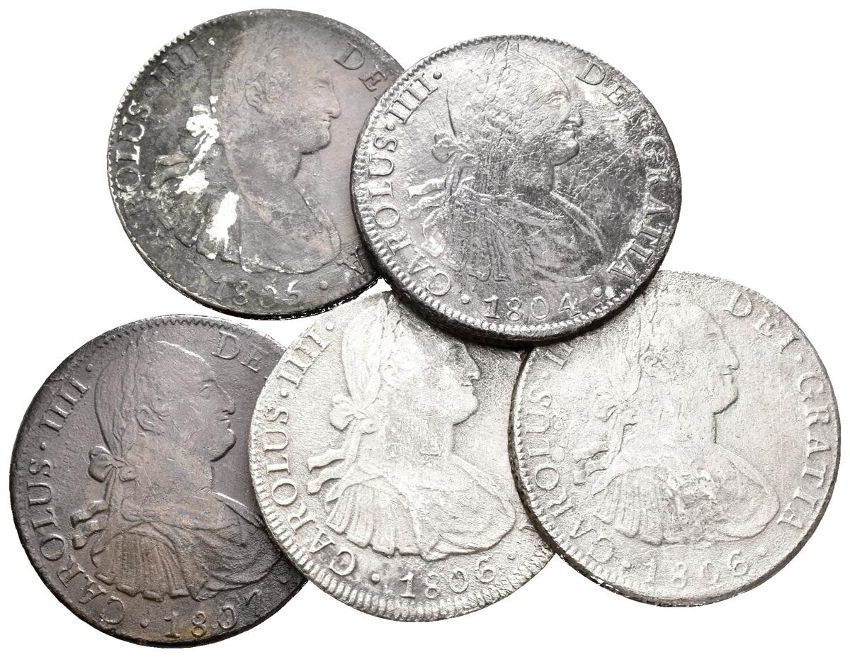 CHARLES IV. Lot consisting of 5 coins of 8 Reales de México: 1804 TH, 1805 TH, 1806 TH (2) and 1807 TH. All with marine oxidation. Ar. BC + / F. TO EXAMINE.
