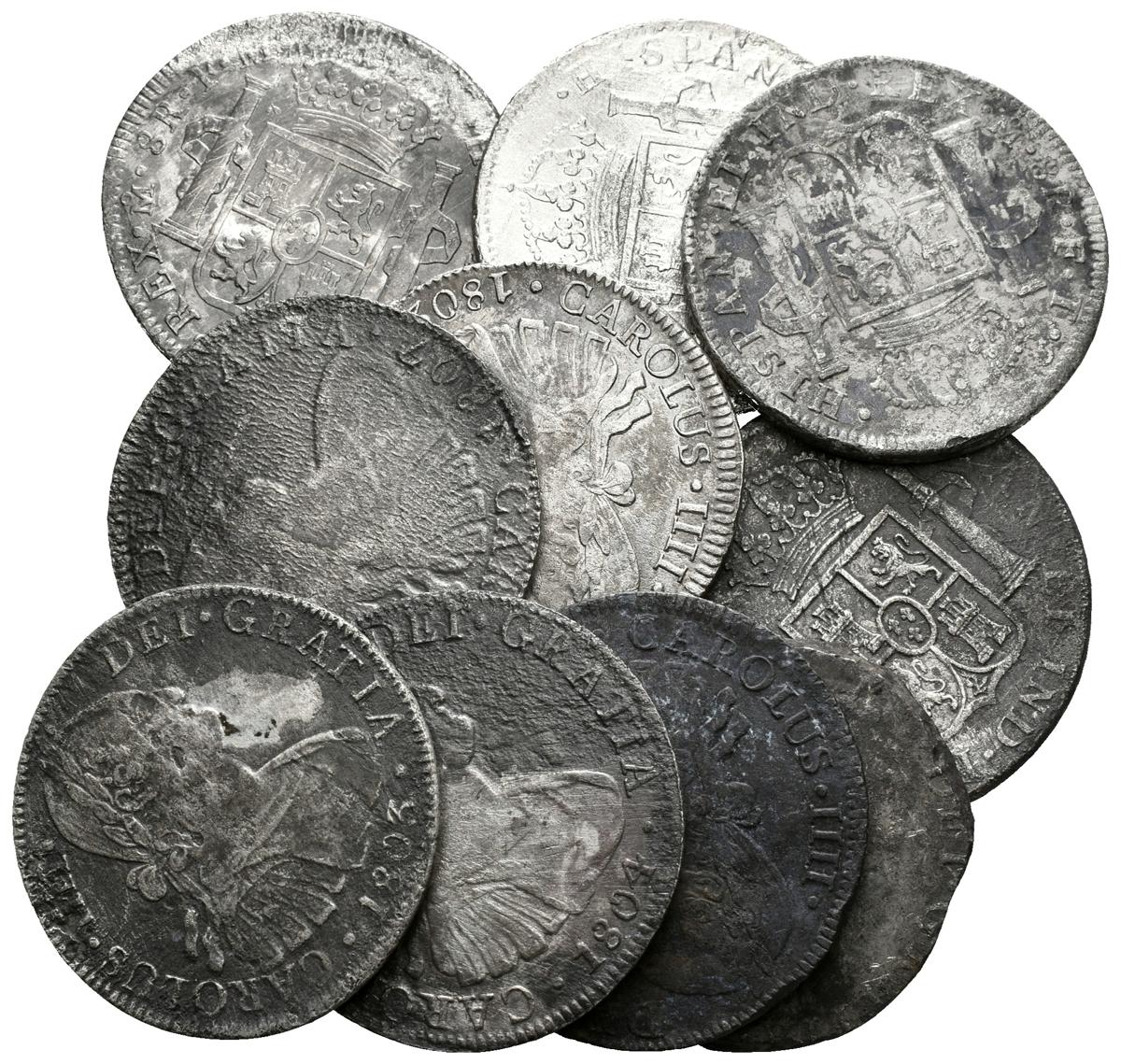 CHARLES IV. Lot consisting of 10 coins of 8 Reales from the mint of Mexico, containing: 1790 FM (bust of Carlos III), 1797 FM, 1798 FM, 1801 FT, 1802 FT, 1803 FT, 1804 TH, 1805 TH, 1806 TH and 1807 TH. All with marine oxidation. Ar. BC + / F. TO EXAMINE.