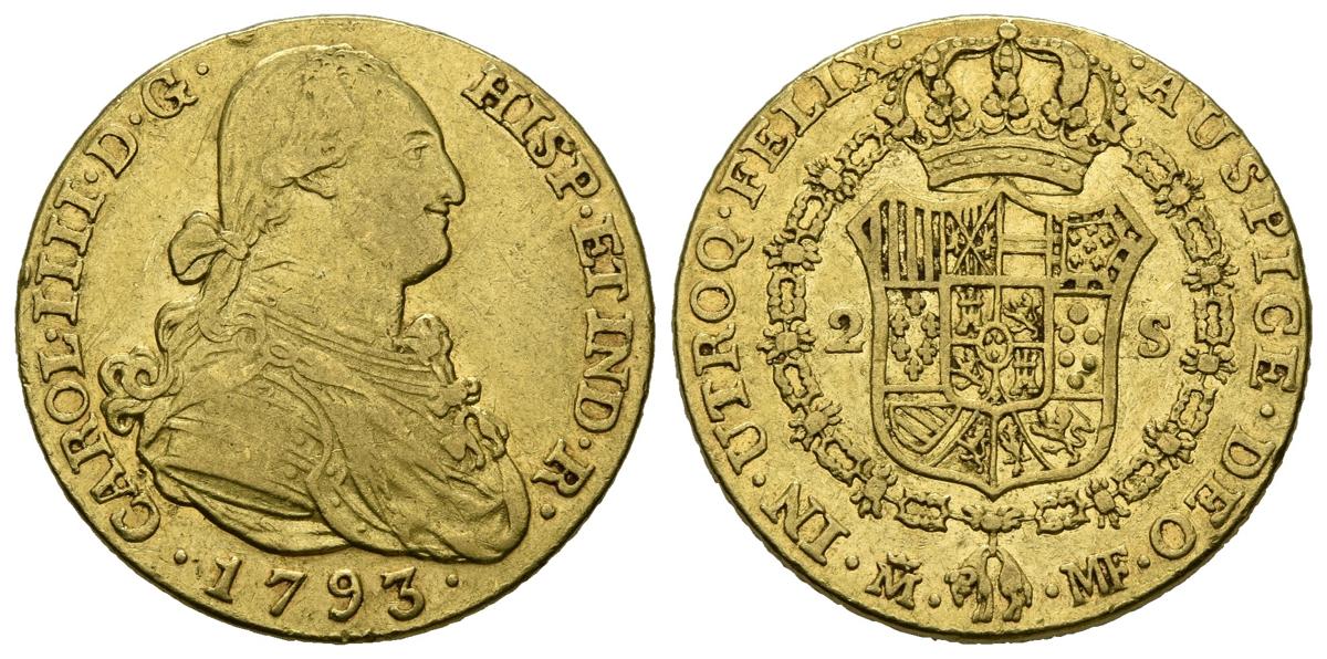 CHARLES IV (1788-1808). 2 Shields. (Au 6.24g / 21mm). 1793. Madrid MF. (Cal-2019-1279). F.