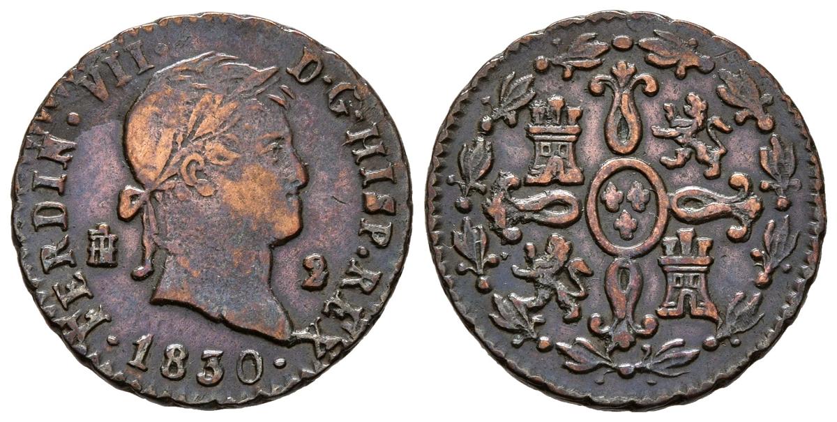 FERNANDO VII (1833-1868). 2 Maravedís (Ae. 2.43g / 19mm). 1830. Segovia. (Cal-2019-152). VF. Beautiful iridescent patina.