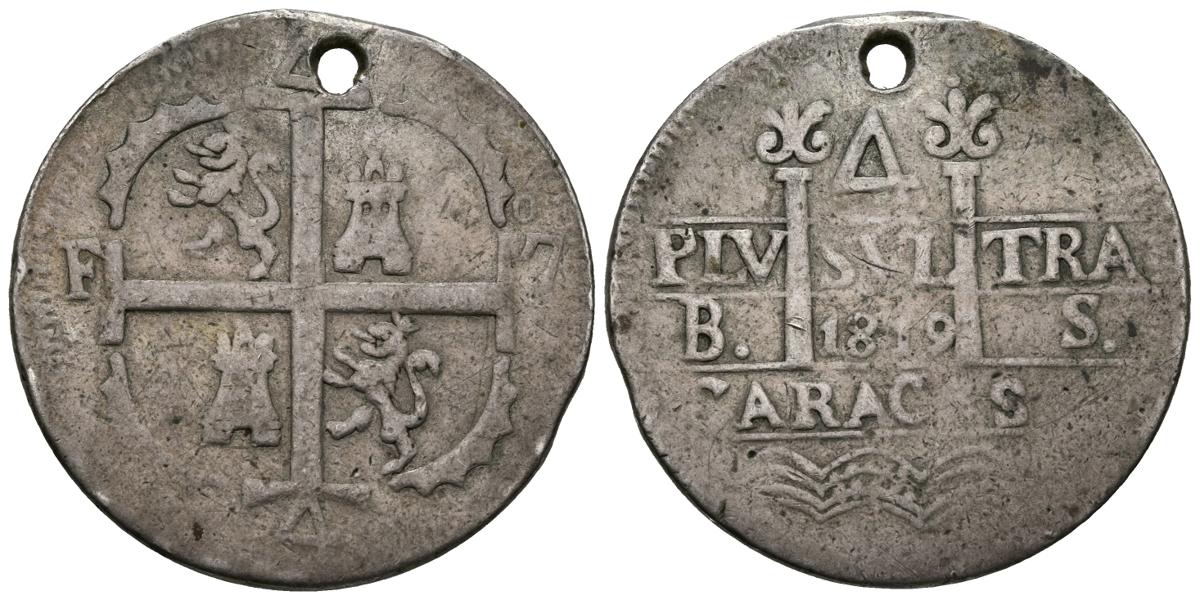 FERNANDO VII (1808-1833). 4 Real. (Ar. 10.81g / 31mm). 1819. Caracas. (Cal-2019-1029). Lions and Castles. BC +. Drilling. Very Rare. Ex Aureo & Calicó 293 (05/24/2017), Nº2447.