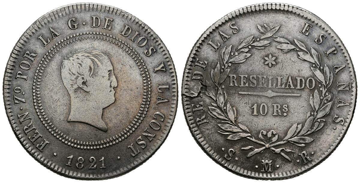 English FERNANDO VII (1808-1833). 10 Reais. (Ar. 13.39g / 34mm). 1821. Madrid SR. (Cal-2019-1088). VG. Reverse sheet.
