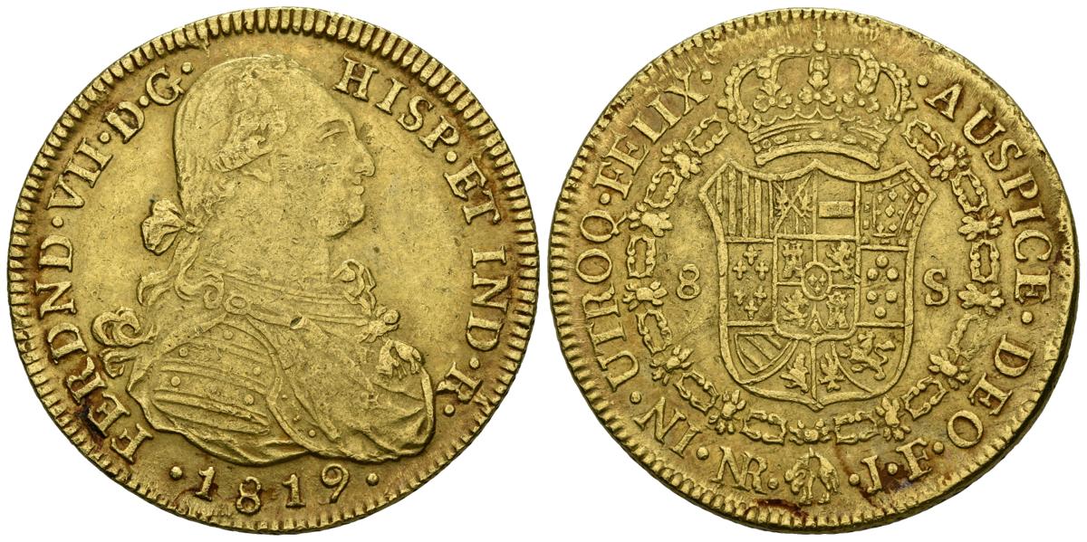 FERNANDO VII (1808-1833). 8 Shield. (Au. 27.02g / 37mm). 1819. New Kingdom JF. (Cal-2019-1857). VG.