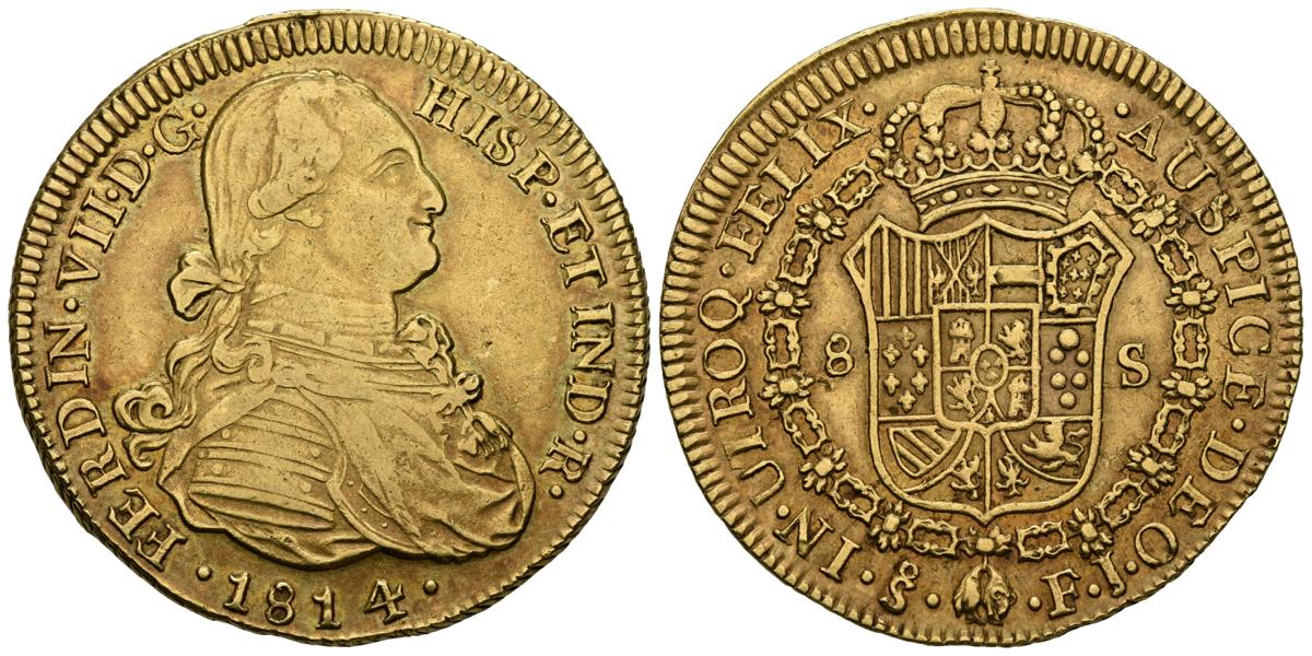 FERNANDO VII (1808-1833). 8 Shields. (Au. 25.79g / 38mm). 1814. Santiago FJ. (Cal-2019-1871). F. Little leaves. Edge repair.