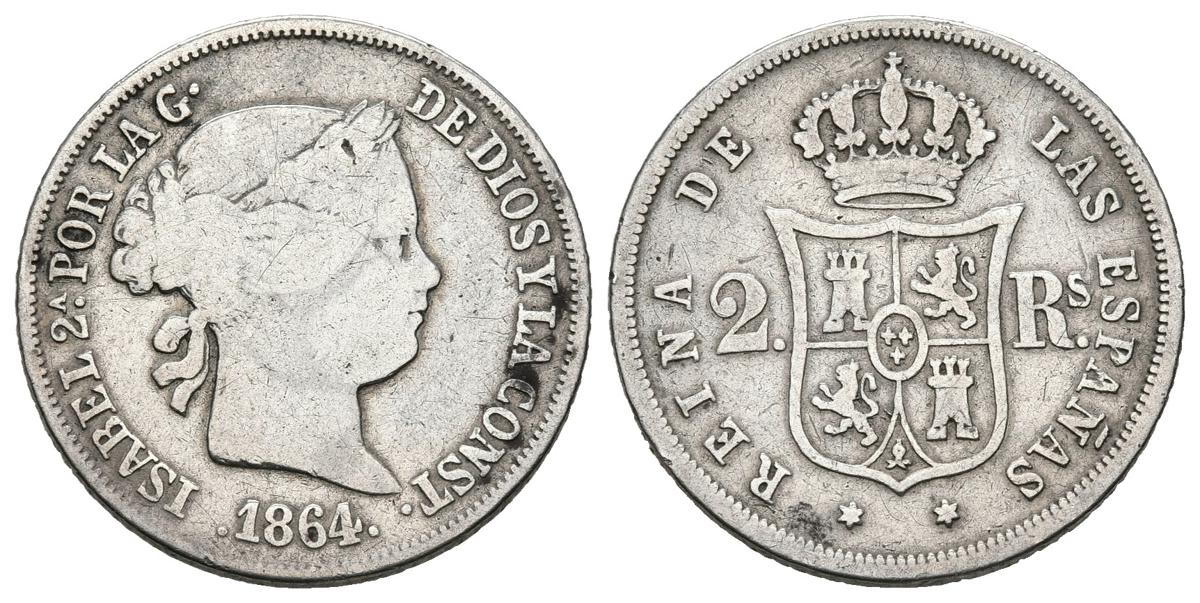 English ISABEL II (1833-1868). 2 Reais (Ar. 2.52g / 18mm). 1864. Madrid. (Cal-2019-379). BC + / F. Very scarce.
