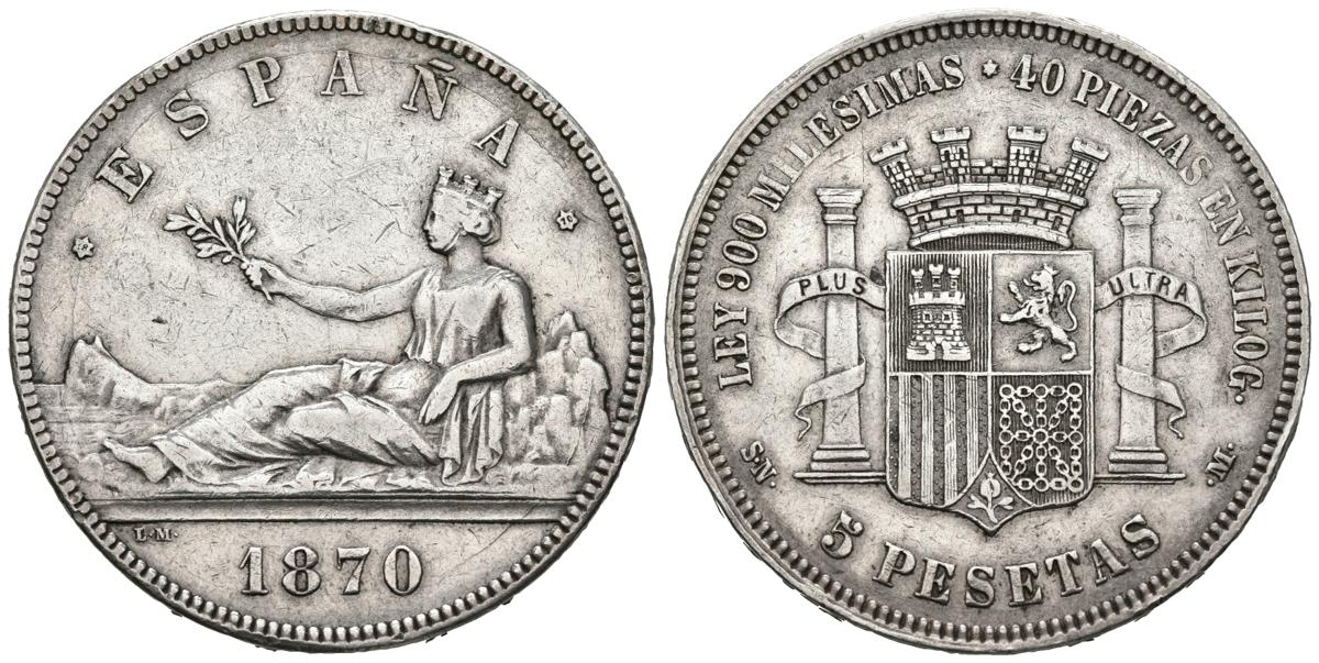 PROVISIONAL GOVERNMENT (1868-1871). 5 Pesetas. (Ar. 24.84g / 37mm). 1870 * 18-70. Madrid SNM. (Cal-2019-39). F.