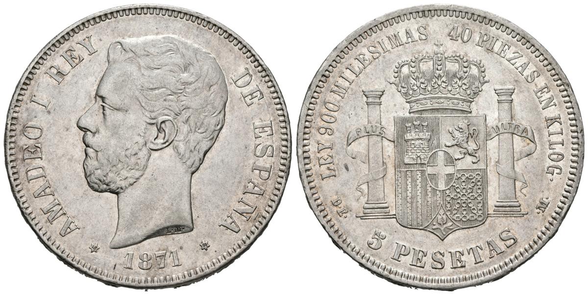 AMADEO I (1871-1873). 5 Pesetas. (Ar. 24.87g / 37mm). 1871 * 18-74. Madrid DEM. (Cal-2019-5). VF.