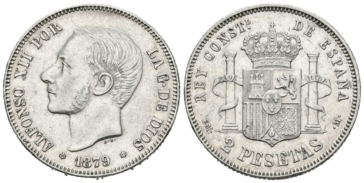 English ALFONSO XII (1874-1885). 2 Pesetas. (Ar. 10.11g / 27mm). 1879 * 18-79. Madrid EMM. (Cal-2019-26). VF.